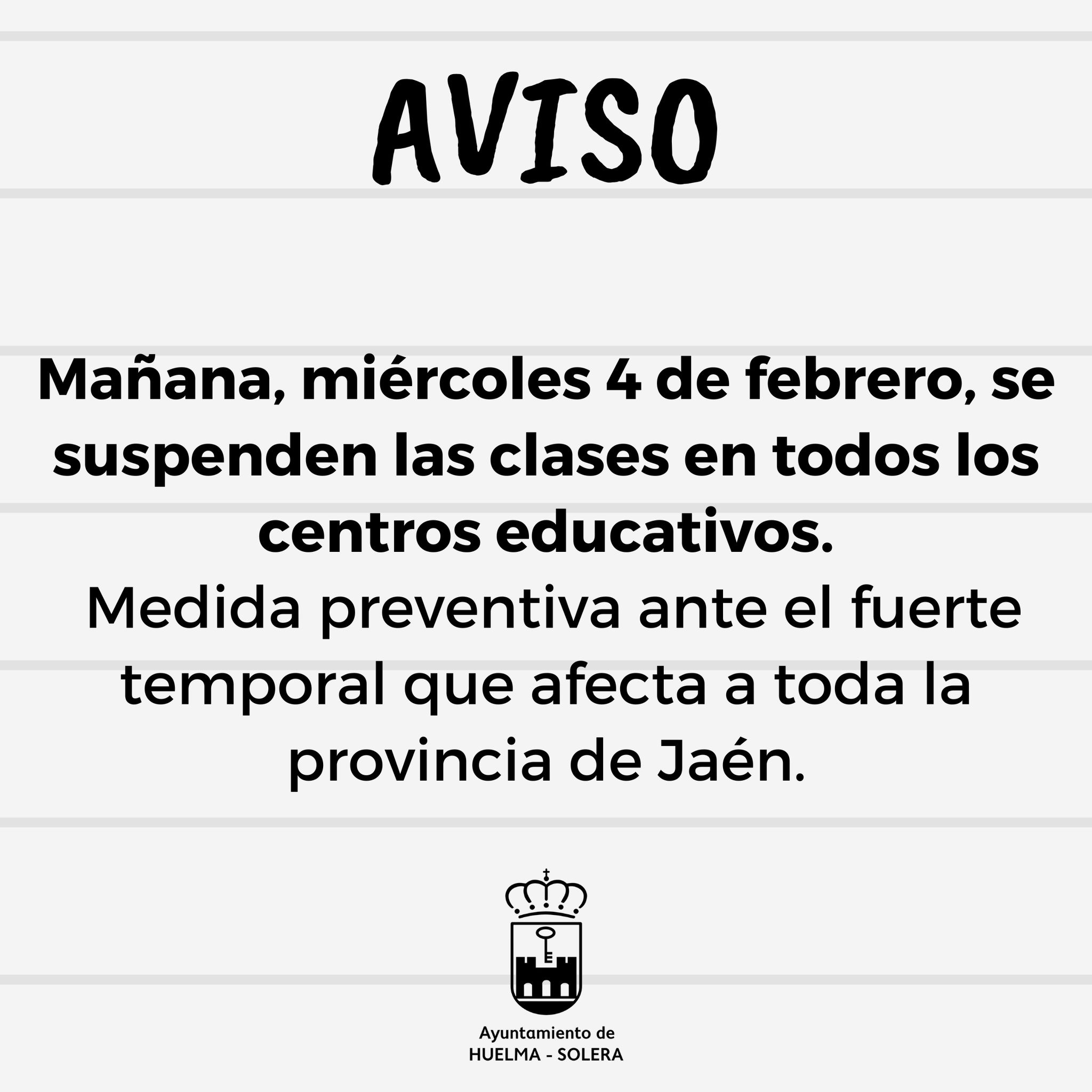 Siguiendo las indicaciones oficiales sobre la suspensión de la actividad lectiva en todos los centros educativos, desde el Ayuntamiento de Huelma y Solera informamos que también quedan suspendidas todas las actividades deportivas y/o lúdicas organizadas por el Ayuntamiento durante el miércoles 4 de febrero 🗓️
