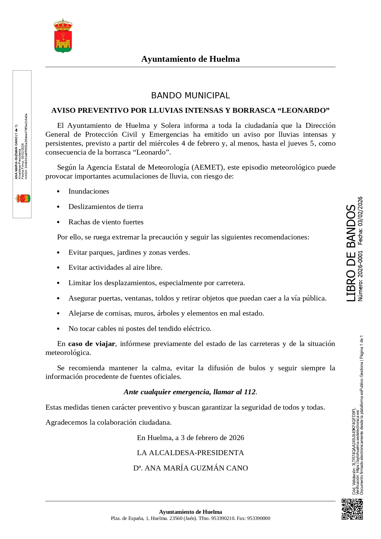 Desde el Ayuntamiento de Huelma y Solera informamos a la ciudadanía de que la Dirección General de Protección Civil y Emergencias ha emitido un aviso por lluvias intensas y persistentes, a partir del miércoles 4 de febrero y, al menos, hasta el jueves 5, debido a la borrasca Leonardo.
